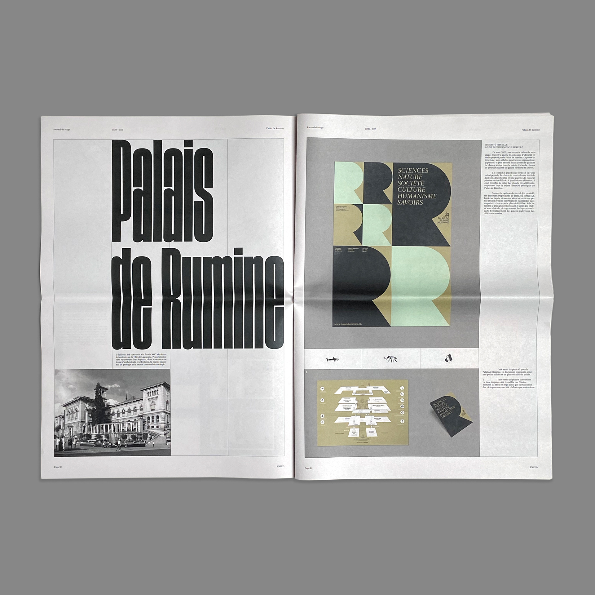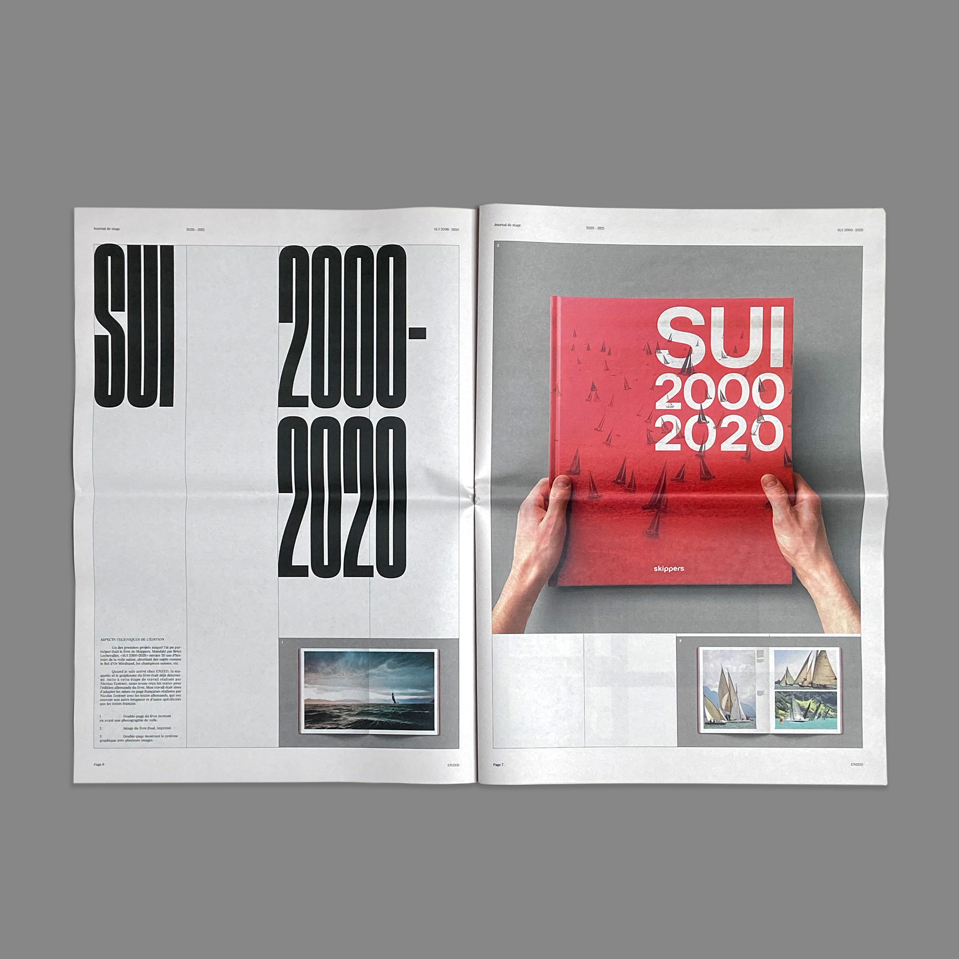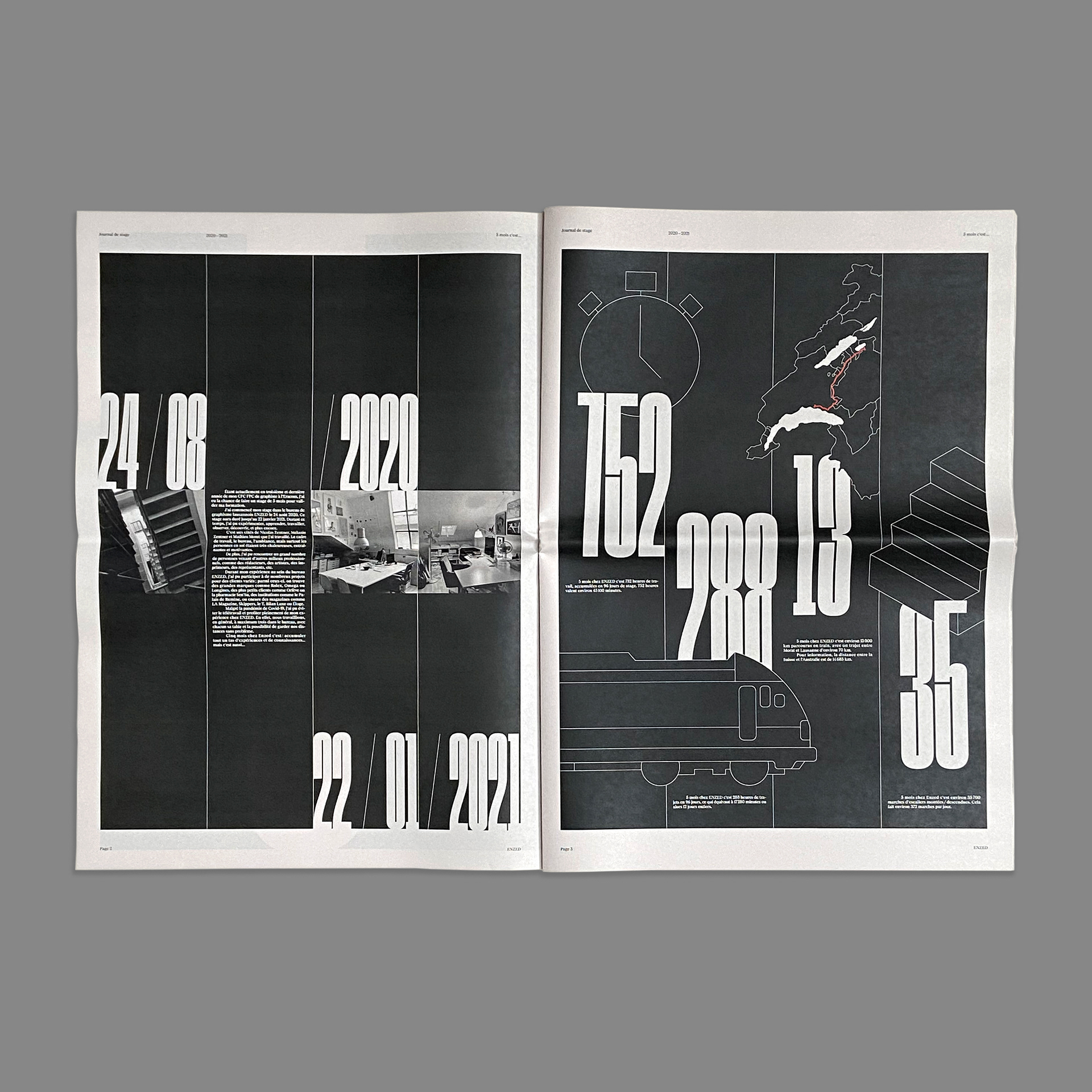 Journal de stage montrant les projets sur lesquels j’ai travaillé chez ENZED, Lausanne. Imprimé chez Newspaper Club.