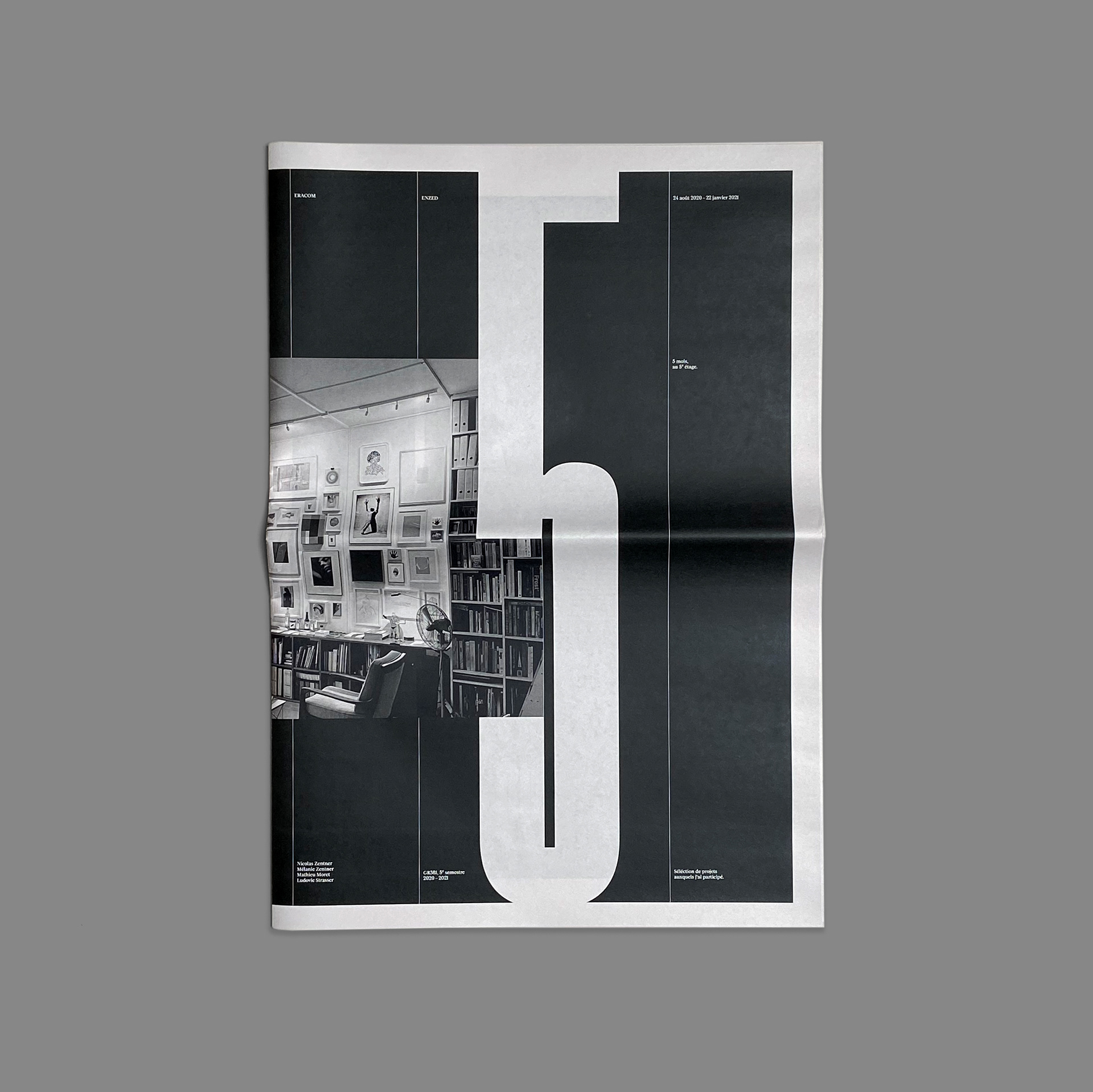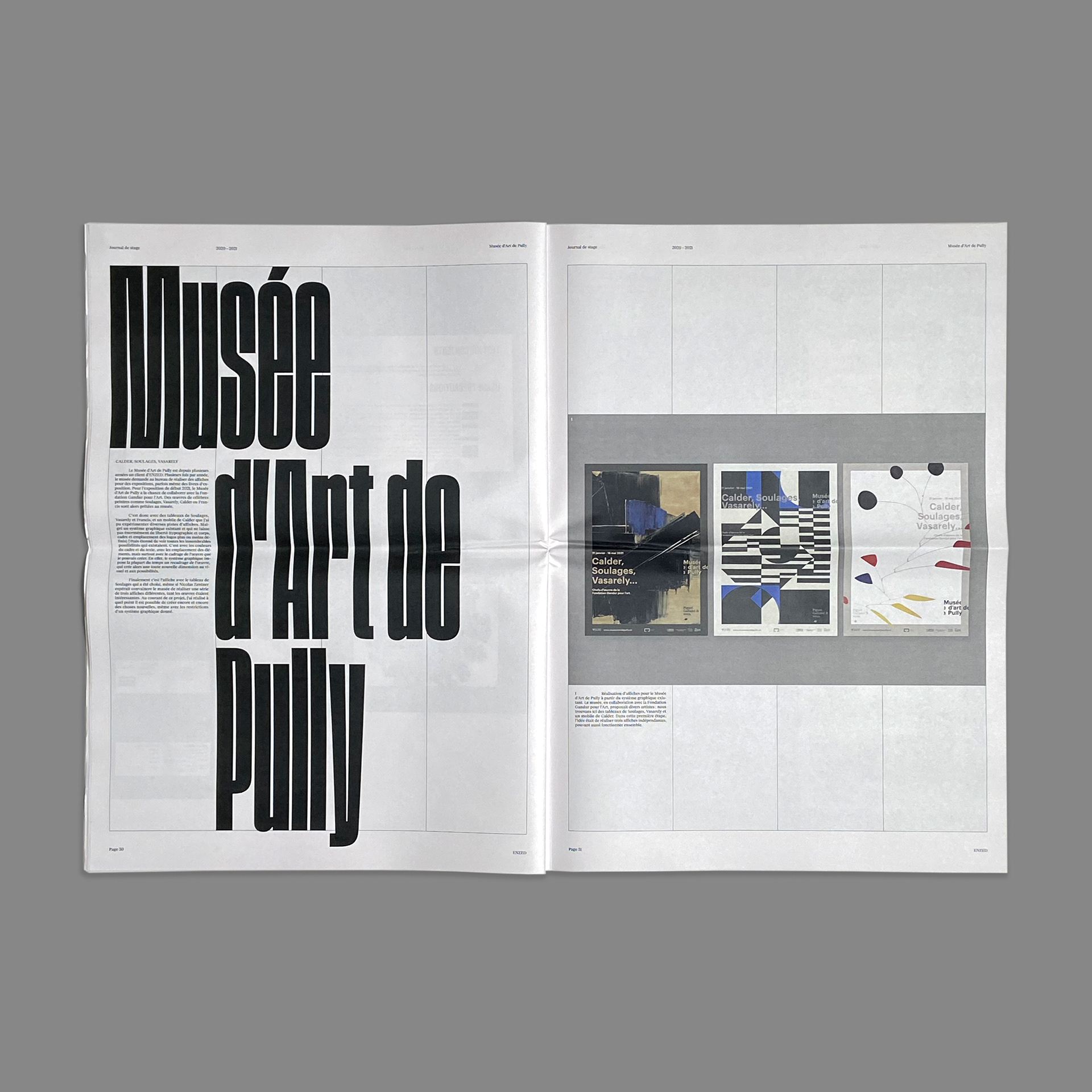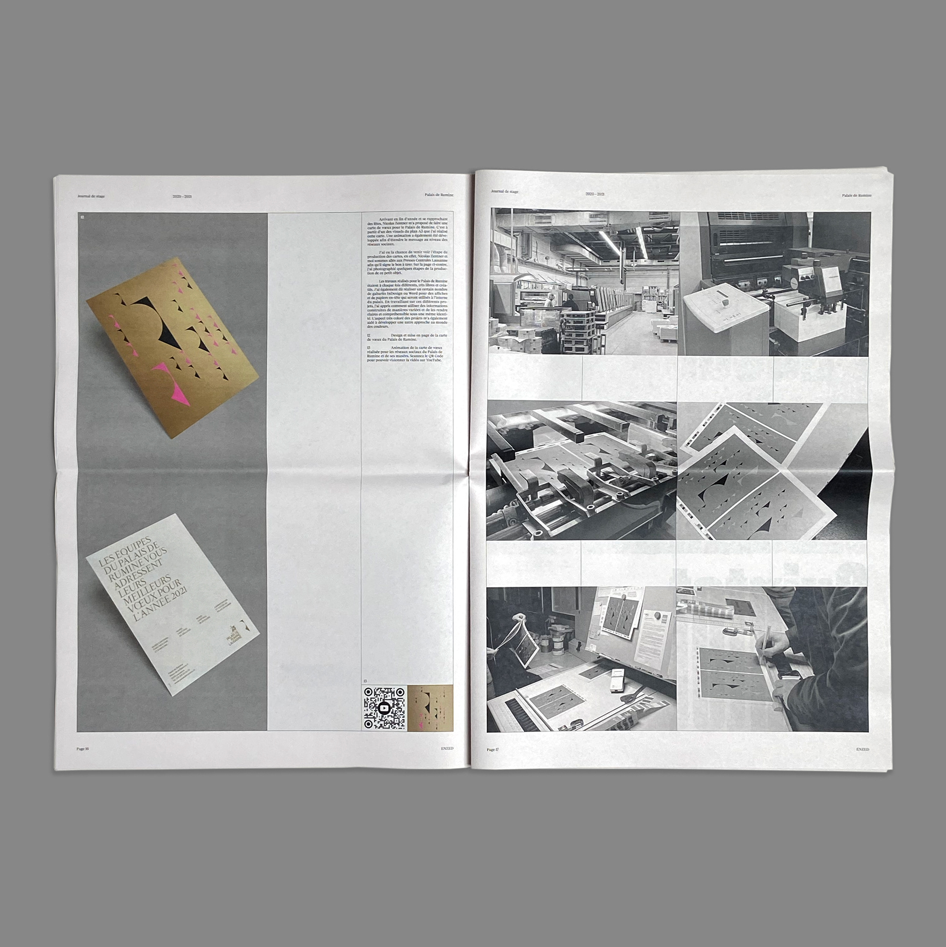 Journal de stage montrant les projets sur lesquels j’ai travaillé chez ENZED, Lausanne. Imprimé chez Newspaper Club.